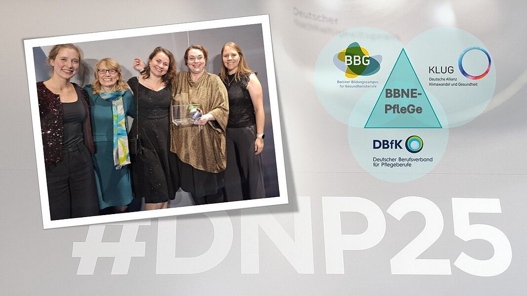 Mit großer Freude können wir verkünden, dass die Berliner Bildungscampus für Gesundheitsberufe gGmbH (BBG) in diesem Jahr mit dem Deutschen Nachhaltigkeitspreis Gesundheit ausgezeichnet wurde. Prämiert wurde das Verbundprojekt „Praxisanleitende in Pflege- und Gesundheitsberufen als Schlüsselpersonen für Berufliche Bildung für nachhaltige Entwicklung“ (BBNE-PfleGe) – ein gemeinsames Vorhaben der BBG, des Deutschen Berufsverbands für Pflegeberufe (DBfK) und der Deutschen Allianz Klimawandel und Gesundheit e. V. (KLUG).